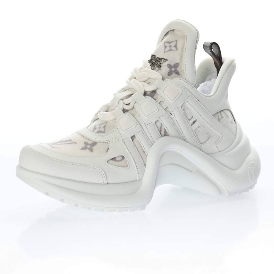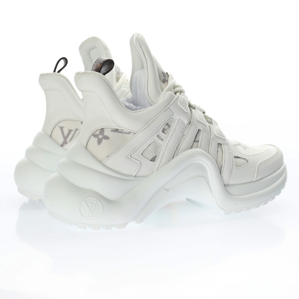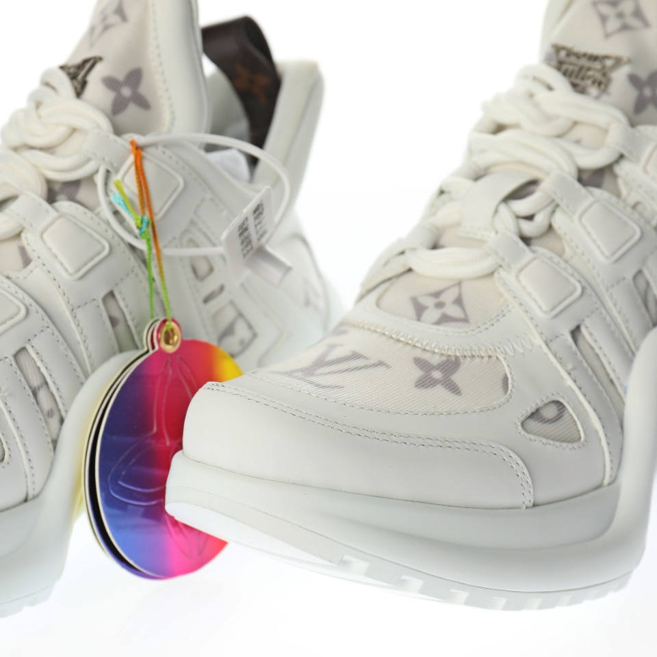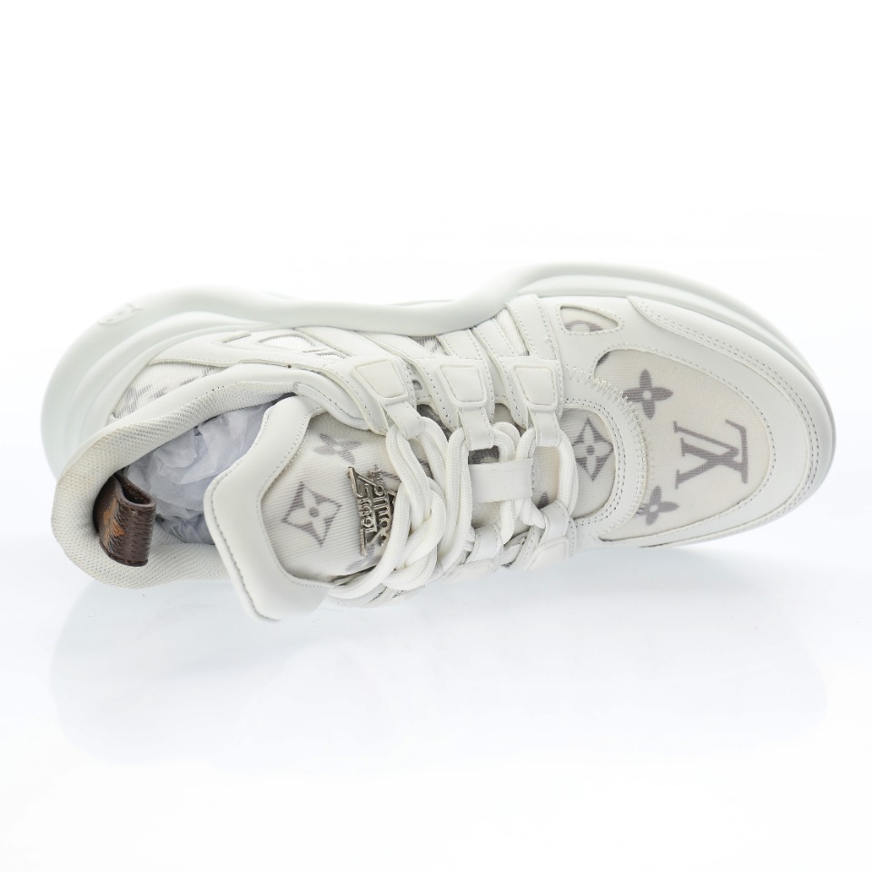 5D effect gift box and complete set of original accessories packaging materials # Supports NFC sensing official website redirection # Pear-shaped super soft sandblasted paper balls + detailed manufacturing of exquisite products # Uses top-grain calfskin leather decorative pieces # Independently developed TPU rebound midsole # Combined TPR wear-resistant outsole # Super soft leather inner foot pads LV genuine leather two-tone shock-absorbing mesh sports bow-shaped dance retro dad sneakers “Leather white mesh woven grey embossed LOGO”